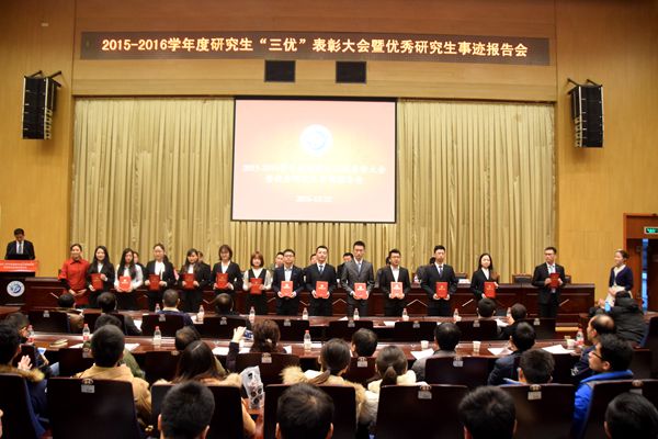 大會對我校研究生先進集體和先進個人進行了表彰。學校評選出“十大杰出研究生”、“十大優秀研究生干部”、“十大學術成就獎”、“優秀研究生班集體”、“優秀研究生”、“優秀研究生干部”、 “研究生國家獎學金”、“研究生學業獎學金”與“研究生學術科技文化活動優秀組織獎”若干。研究生院院長黃志宇宣讀了表彰決定。