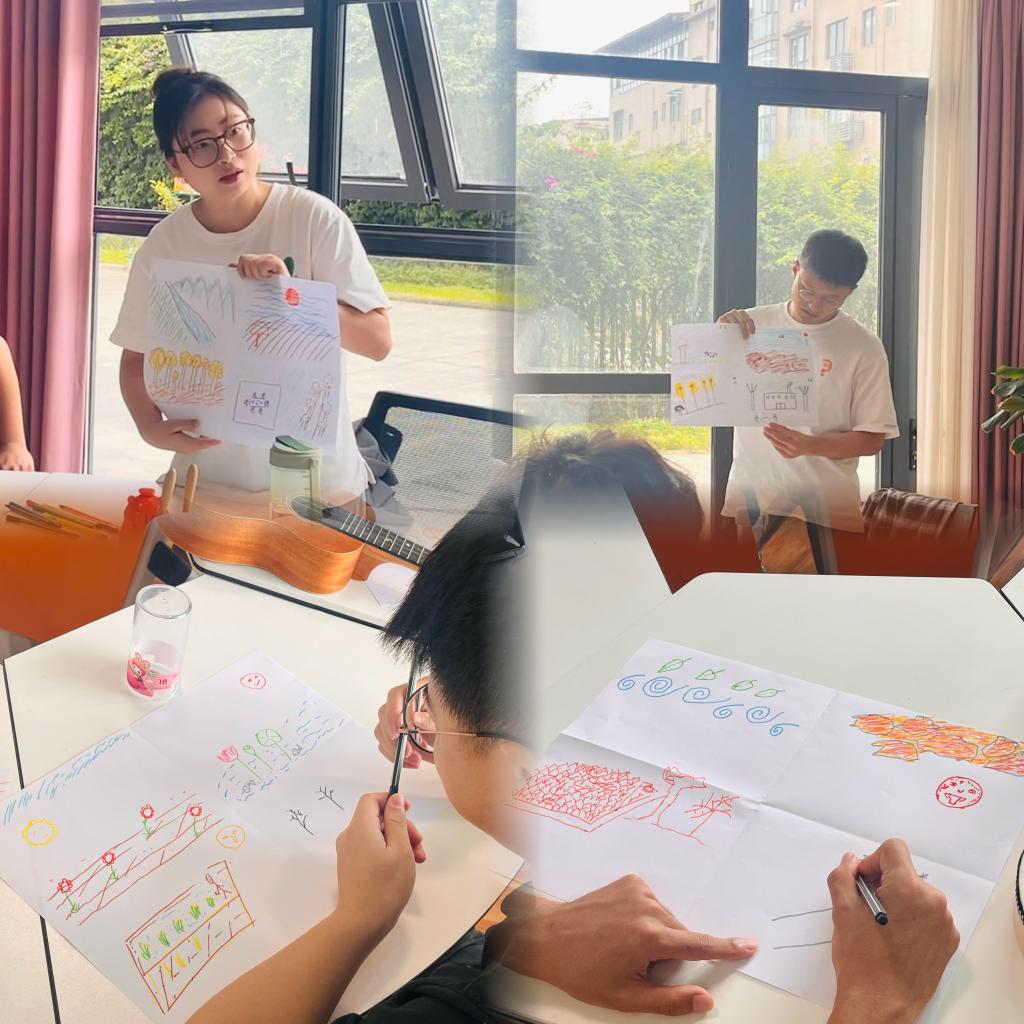 此次活動以“音樂”為主題。活動開場,張老師用音樂聲勢活動“布谷鳥”進行熱身,促使大家相互認識、快速熟絡起來;隨后,鼓勵大家感受當下的情緒并進行評分,通過欣賞四季的音樂,進行意象探索并繪到紙上,形成自己的四季故事,分享作品;接著張老師帶領同學們進入“音樂與意象”的體驗之旅,在舒適的氛圍中進行放松體驗,釋放內心的壓力。“音樂藝術創造的音樂意象,其核心內容是情感或情緒,體會音樂與心靈情感的融合,啟動心能量,擁抱心生活。”張老師說。