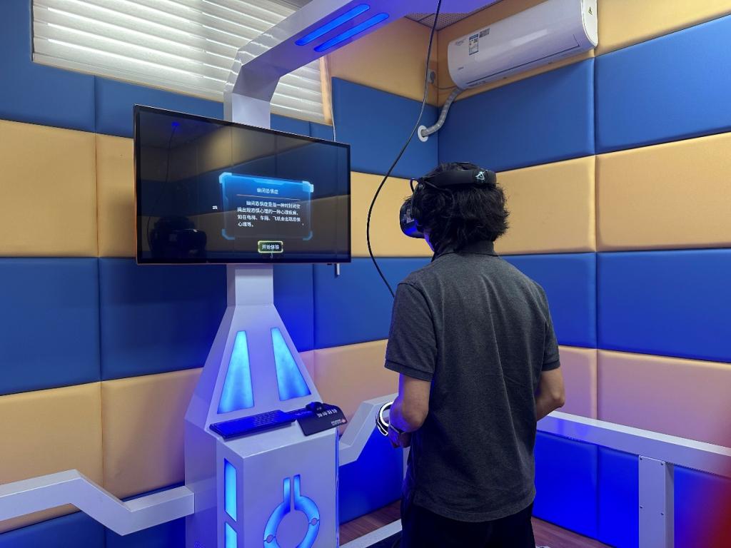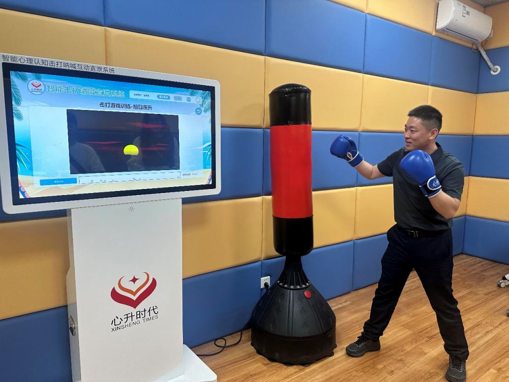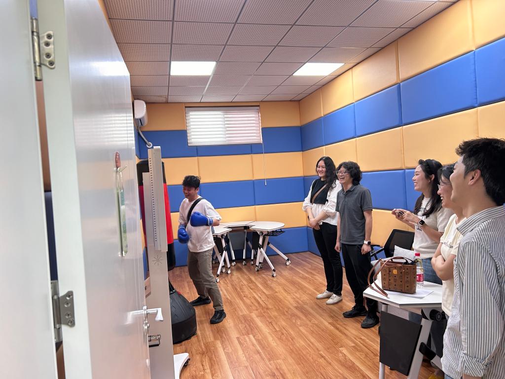 活動(dòng)設(shè)置了熱身游戲、“雨中人”繪畫(huà)、小組討論互動(dòng)、沉浸式身心體驗(yàn)等環(huán)節(jié)。在“雨中人”繪畫(huà)活動(dòng)中,胡美麗帶領(lǐng)各教師通過(guò)繪畫(huà)覺(jué)察自己在壓力下的情緒狀態(tài),隨后各教師通過(guò)分享和討論,掌握日常調(diào)節(jié)負(fù)面情緒,排解壓力的方式。緊接著胡美麗帶領(lǐng)大家進(jìn)行了正念呼吸、肌肉放松訓(xùn)練等心理減壓練習(xí)。活動(dòng)的最后,為更充分進(jìn)行沉浸式的身心放松體驗(yàn),胡美麗帶領(lǐng)全體教師體驗(yàn)了擊打吶喊互動(dòng)宣泄、VR虛擬現(xiàn)實(shí)、音樂(lè)放松等智能化設(shè)備。