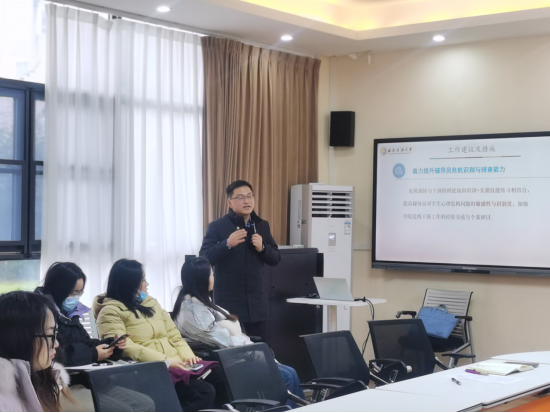 中心教師余強總結了學生心理普測的基本情況和面談中存在的主要問題,他建議各學院要著力提升輔導員危機識別和排查能力,扎實開展心理危機專項排查,加強家校聯動,家校共育,共同促進學生心理健康;提醒老師們要帶著愛看問題,尤其對存在心理問題的學生,支持而不打擾,關注而不影響;建議老師們做好人文關懷,引導學生學習情緒管理的策略和方法,發展積極的人際關系,共同創造和諧美好的文明校園。