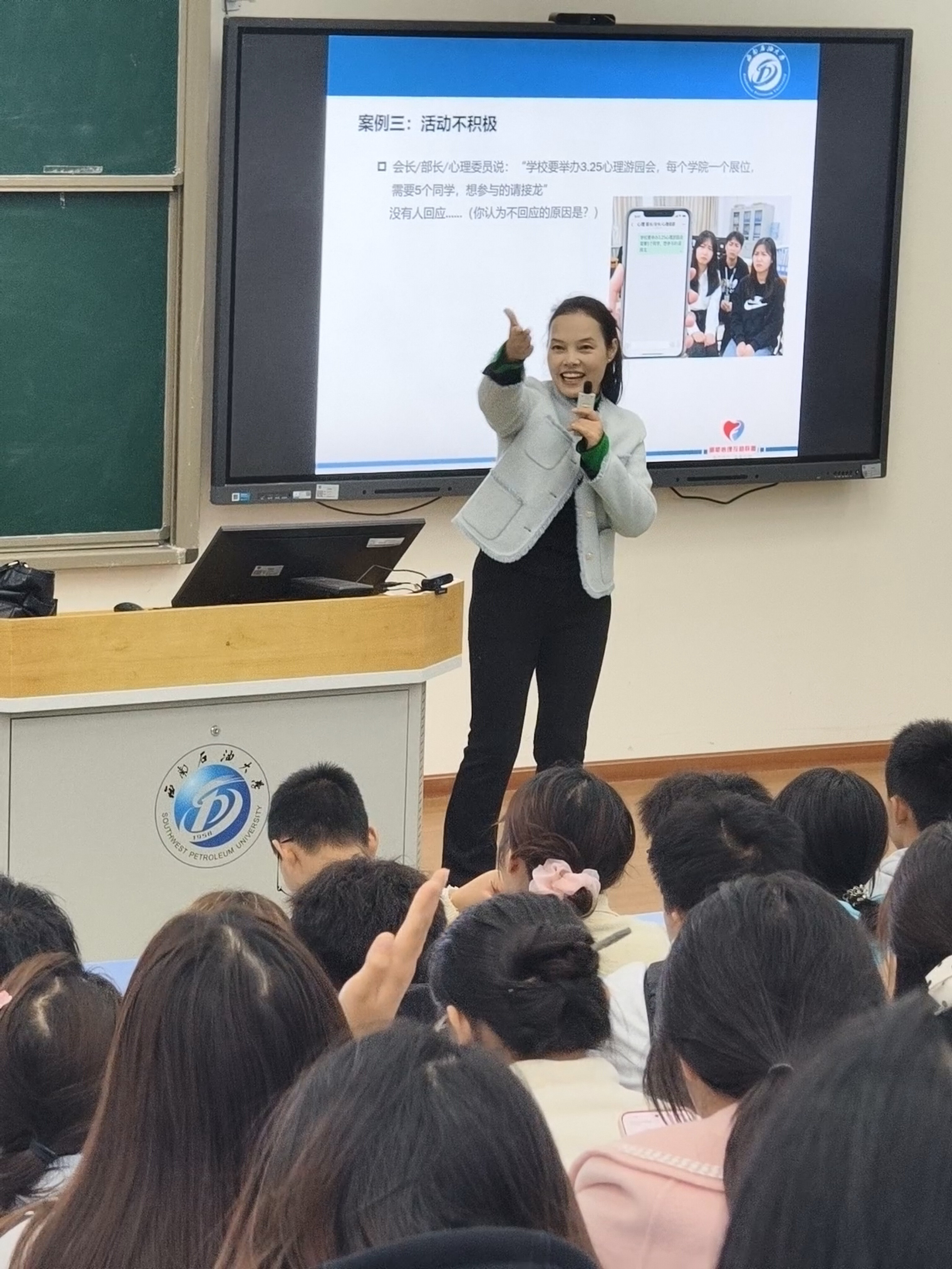 培訓(xùn)從互動(dòng)調(diào)研開始。 劉莉老師首先展示了一項(xiàng)數(shù)據(jù)調(diào)研:“當(dāng)你Emo的時(shí)候,會(huì)給誰說?”顯示出朋輩支持在大學(xué)生情緒疏導(dǎo)中的重要地位,由此引出了心理骨干工作的現(xiàn)實(shí)意義。隨后,老師簡要介紹我校“一年四季,用心陪伴”的心理育人活動(dòng)體系,涵蓋從新學(xué)期的“新生心適應(yīng)講座”、“3.25心理游園會(huì)”,到學(xué)年中的“心理情景劇”、“陽光心成長講座”,以及面向研究生的“心抽靈犀心理沙龍”等貫穿全年的品牌活動(dòng),勾勒出學(xué)校心理健康教育工作的整體脈絡(luò),也明確了心理委員在其中扮演的關(guān)鍵角色。