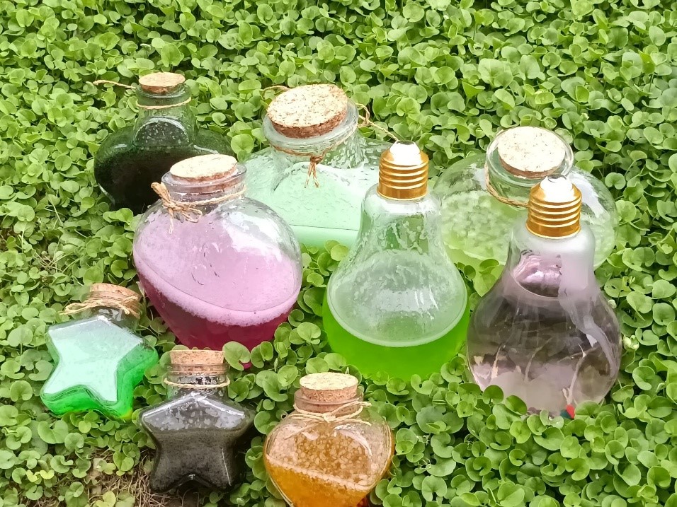 刺鼻的樟腦味逐漸消散,溶液隨之變得清澈透亮,最終,混合溶液被注入造型各異的玻璃瓶,加入靛藍顏料與海綿寶寶裝飾物的瞬間,實驗室仿佛變成童話工坊。