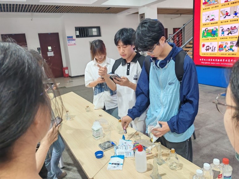 活動伊始,參與者們至實驗臺前挑選心儀的玻璃瓶——星星、愛心、燈塔等造型的器皿在燈光下折射出琉璃般的光澤。“硝酸鉀和氯化銨的混合溶液負責控制結晶速度,樟腦乙醇溶液則是天氣瓶的‘晴雨表’。”主講解員曹琰麒邊演示邊闡釋科學原理。同學們在工作人員的指導下兩兩協作,精確稱量2.5克硝酸鉀與氯化銨溶于33毫升蒸餾水,又將天然樟腦溶于40毫升乙醇,嚴謹的操作讓溶液A、B的配制效率遠超預期。當溶液B緩緩注入溶液A時,燒杯中頃刻綻放出雪花狀結晶,引得陣陣驚嘆。“水浴加熱不僅是為了溶解樟腦,更是模擬自然界溫度變化的預演。”負責安全的張怡靈提醒大家保持操作距離。隨著熱水的激蕩,