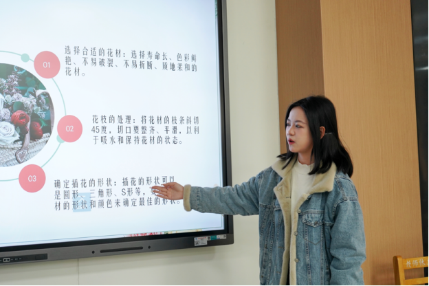 活動伊始,蘇藝同學通過圖文結合的方式詳細講解花藝的起源和插花的技巧,圍繞鮮花分類、色彩搭配、日常養護等插花技巧及注意事項進行講解,幫助大家進一步了解關于花藝方面的知識,對活動目的意義和安全進行強調。隨后,她上手演示插花方式,引導大家感受花草之美。